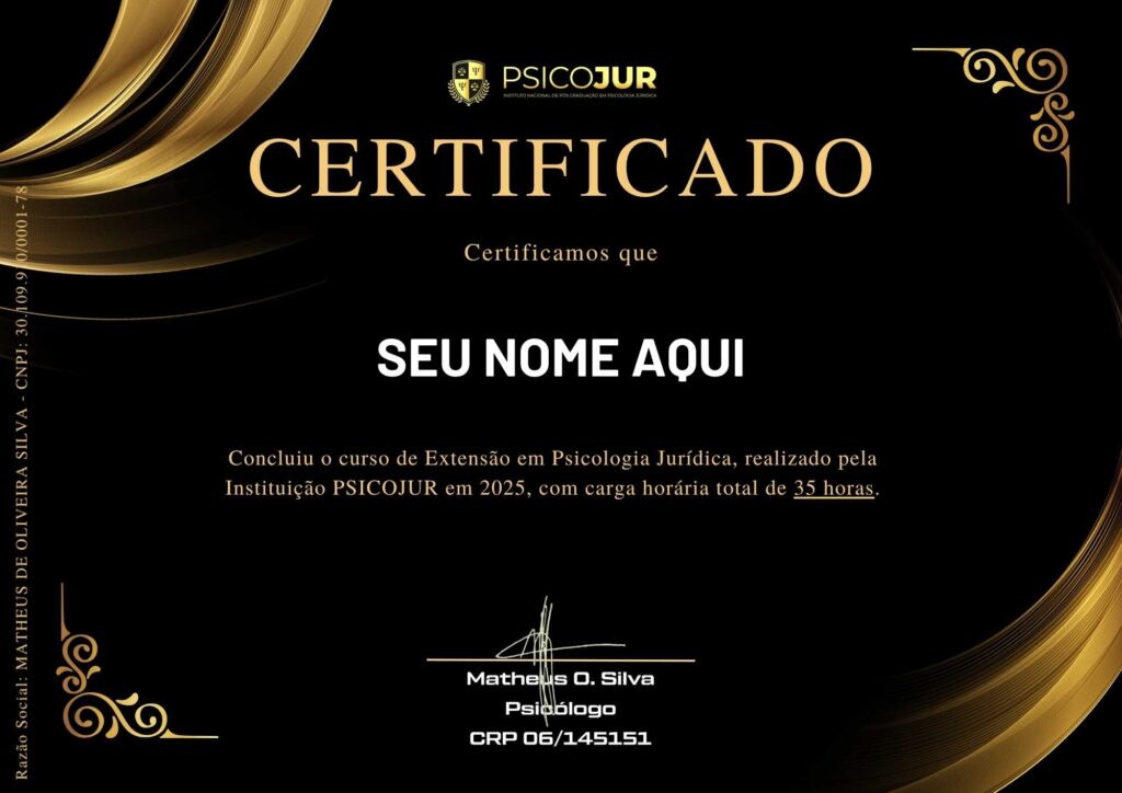 Após finalizar todas as aulas do curso você terá acesso a um certificado de conclusão atestando a sua conclusão no Curso de Extensão em Psicologia Jurídica.